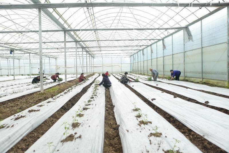 近日民银证券,四川资阳安岳县乾龙镇的蔬菜示范基地内一派繁忙景象。十余名村民正在整齐划一的温室大棚中移栽辣椒幼苗,现场井然有序、干劲十足。